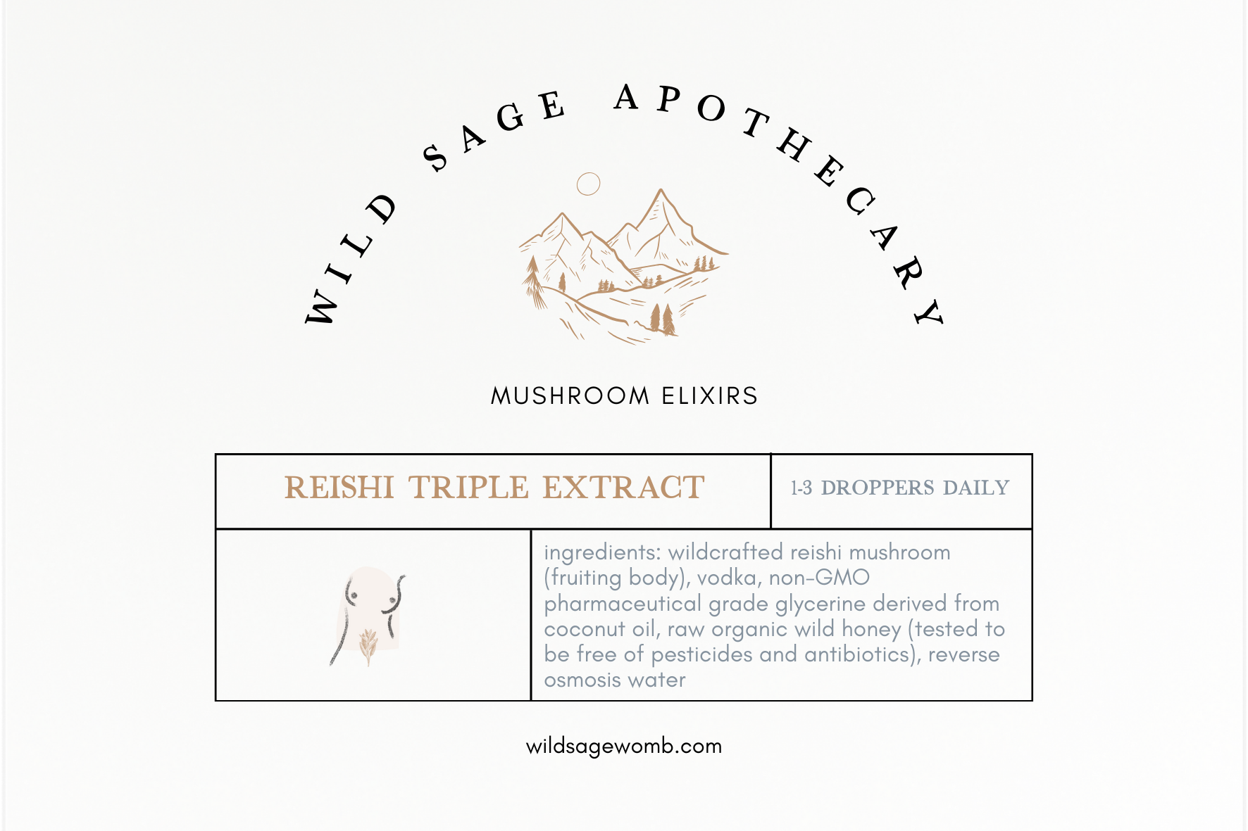 Ingredients: wildcrafted reishi mushroom (fruiting body), vodka, non-GMO pharmaceutical grade glycerine derived from coconut oil, raw organic wild honey (tested to be free of pesticides and antibiotics), purified water, love + intention