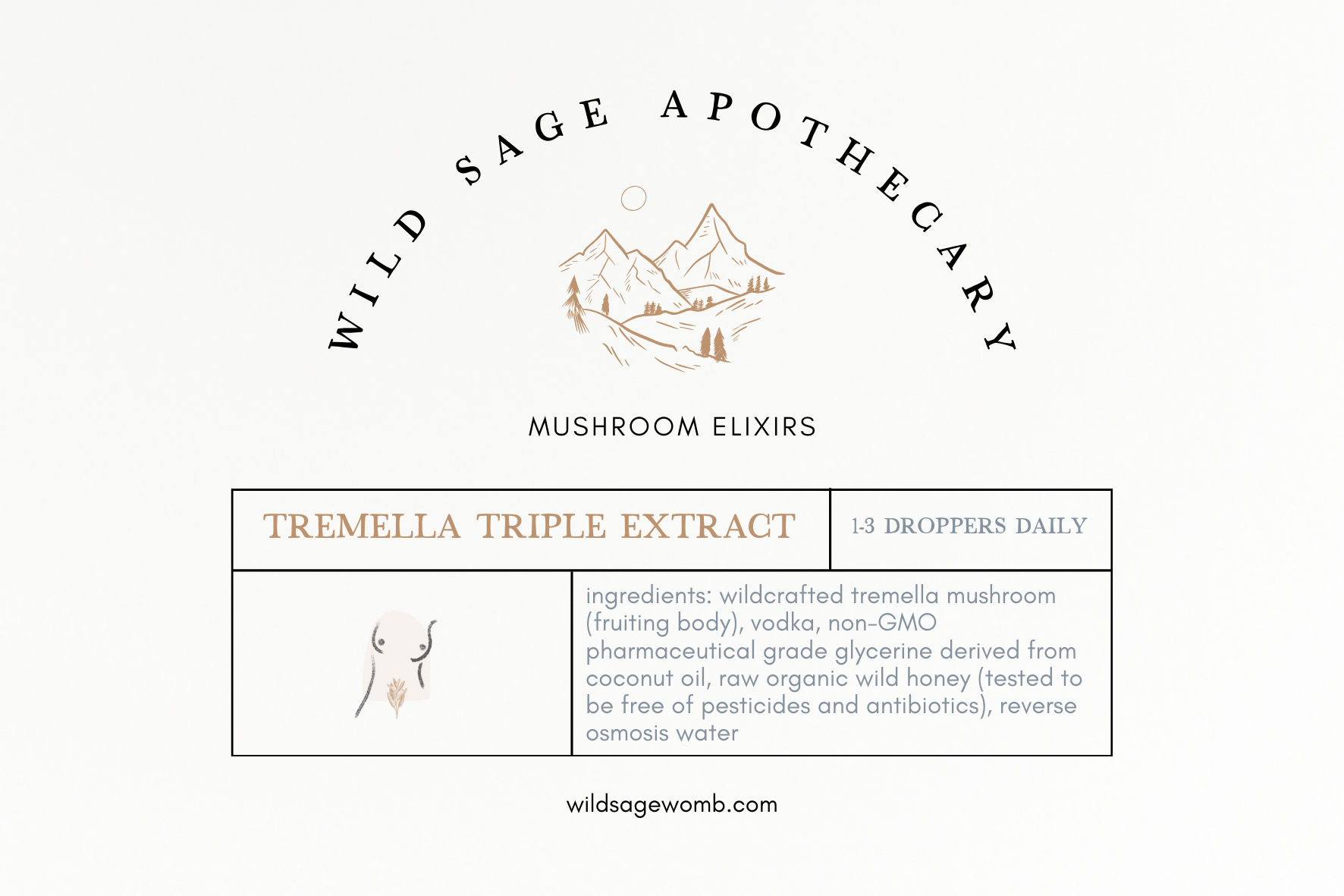 Ingredients: wildcrafted tremella mushroom (fruiting body), vodka, non-GMO pharmaceutical grade glycerine derived from coconut oil, raw organic wild honey (tested to be free of pesticides and antibiotics), purified water, love + intention
